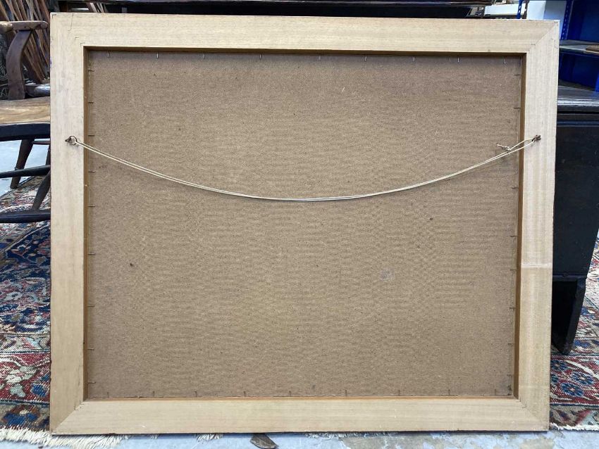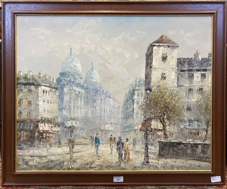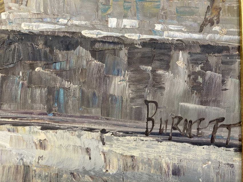 Caroline C. Burnett (1877-1950): British American oil on board Impressionistic Parisian street scene, palette knife on canvas board signed lower right (Burnett was a member of the Societe de Beaux Arts in Paris where she exhibited) c1930s-1940s, framed, overall size 87cm x 72cm.