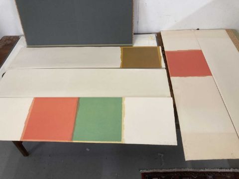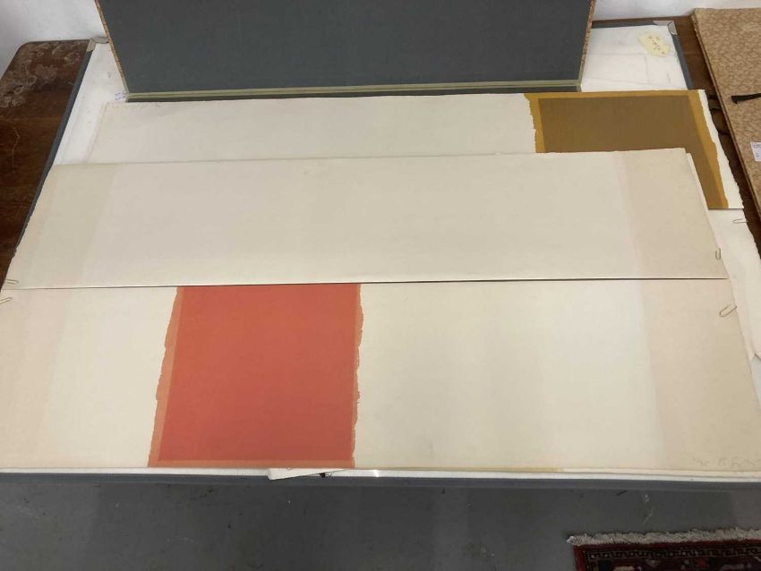 * Richard Smith (1931-2016): Pieces of Eight (Red and Green Squares); Pieces of Eight (Pink Square); Pieces of Eight (Ochre Square) each signed, dated and numbered 21/35 R. Smith 77 (in pencil lower right). Lithographs, unframed. Each 48.6cm x 100.6cm. (3)NB This item may be subject to artist resale rights.