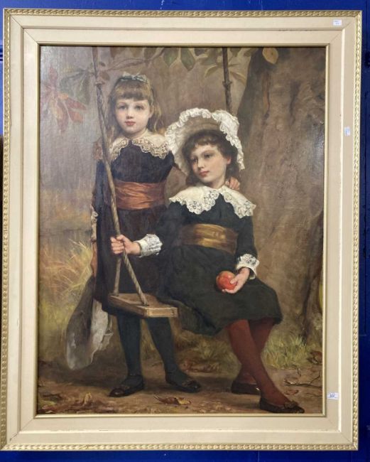 Charles Palmer Downing RA (1847-1902): Romantic School oil on canvas full length portrait of two sisters one seated on a rope swing, in a naturalistic wooded parkland setting, relined, no losses to image, circa 1900 in a contemporary frame, overall size 90cm x 170cm.