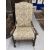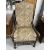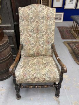 Furniture: 19th-century oak throne chair with scrolled arms and upholstered seat and back.