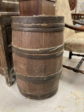 Treen: 19th cent wood banded oak store barrel with lid—46 cm at the mouth and 75cm tall.