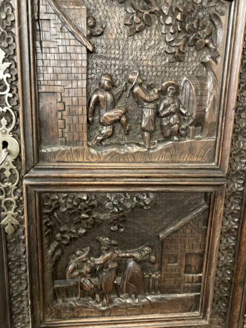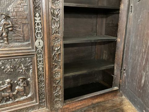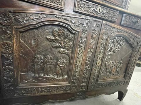 Furniture: Early 19th century ''French Bretton Oak /Livery Cupboard dresser'' the remade cornice over two doors with four profusely carved panels depicting village/tavern life, bordered by repetitive chip carved detail, above three frieze drawers, over two main doors each carved with a panel as above. Traditional peg joint and tenon construction, fitted shelf interior.Height - 213cmWidth - 138cmdepth - 67cm