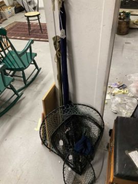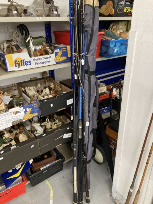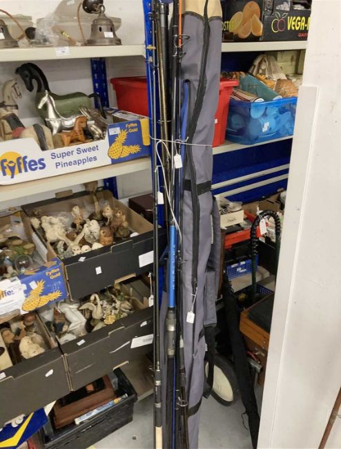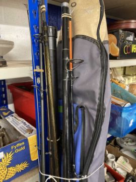Fishing: Hardy fly rod (graphite) and a Hardy St Aidan reel. A Sonik spin rod mint condition, a Shakespeare Voyager fly telescopic rod, three landing nets and split cane two-piece.