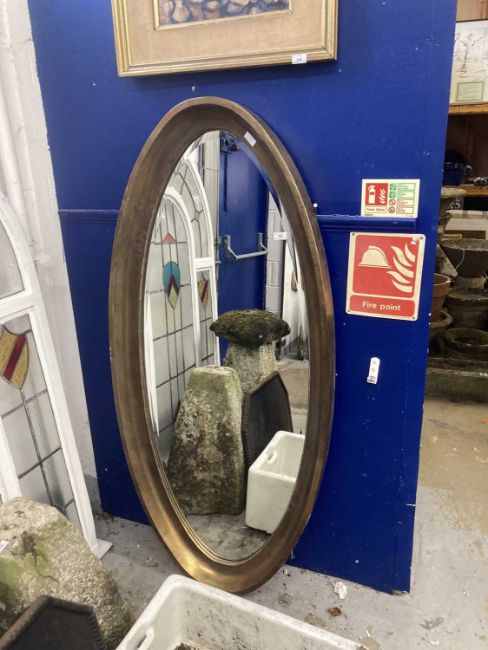 Mirrors: An unusual mid 20th century oval mirror with gilt frame, mid 70s, with bevelled edged glass, overall size 165cm x 77cm.