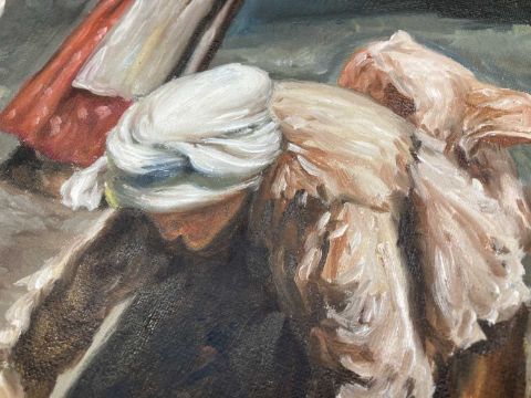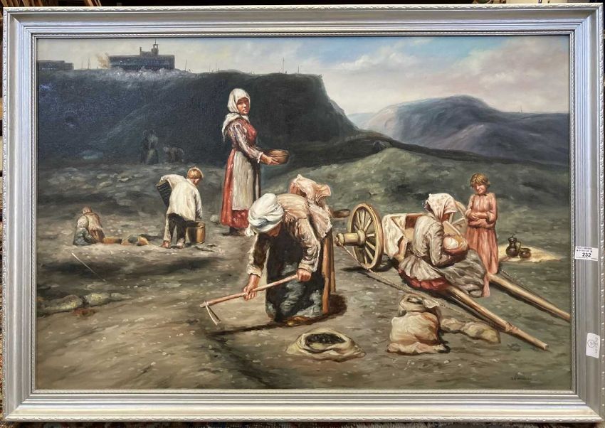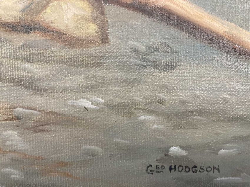 Geo Hodgson: Late 20th cent. Oil on canvas, women and children working the land, signed Geo Hodgson lower right, copy after George B. Hodgson 1847-1921, framed, overall size 98cm x 72cm.