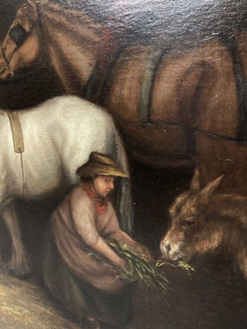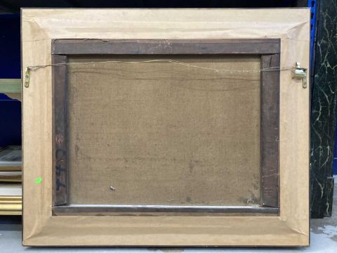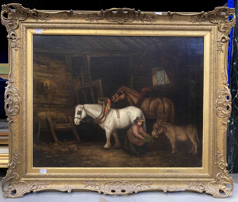 Picture: Oil on canvas "In the Hay Barn" European School, early 1900's reclined/gilt slip within ornate gilt frame. Unsigned, overall size 90cm x 72cm.