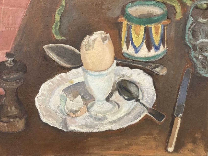 Pictures: Edward Lewis British School 1936- 2018. ''Boiled egg and runner beans'' Oil on canvas signed and dated 73' Framed. 60cm x 60cm