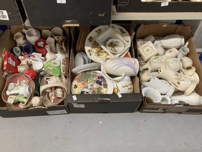 Ceramics: Belleek, Maling, Wedgwood etc, jugs, plates, framed plaques, vases, etc. 3 Boxes.