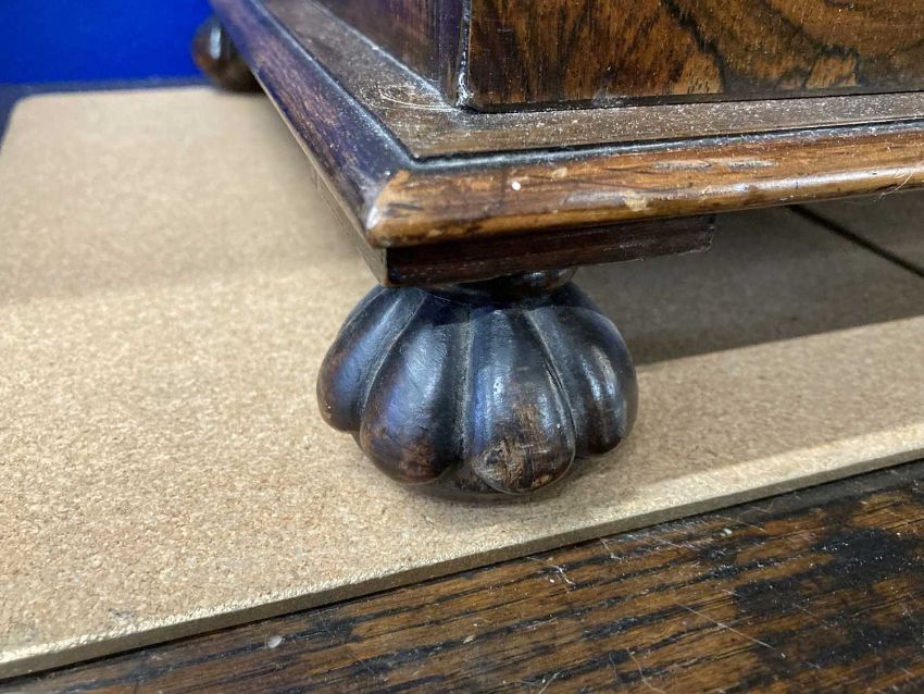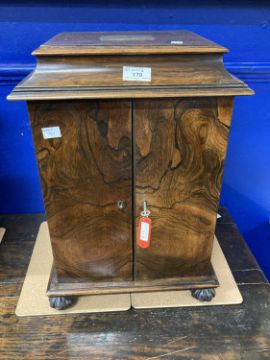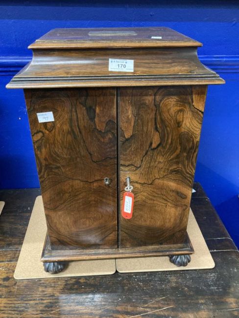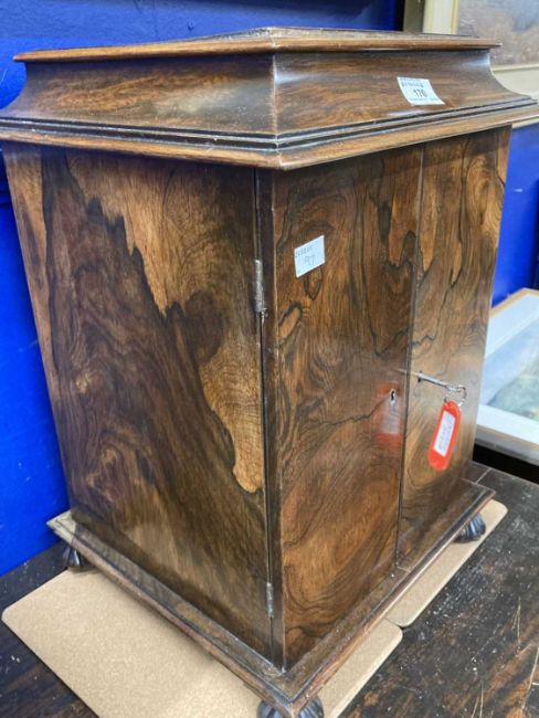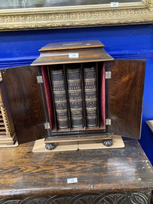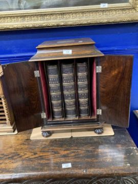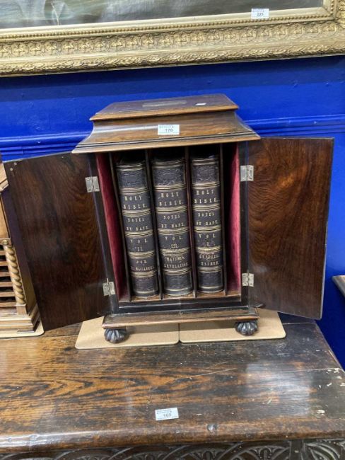 19th Century: Figured mahogany standing bible cabinet presented to Rev. John Brownlow from the Parishioners of Ballinascreen as a Mark of Respect and Esteem, 19ins x 13ins x 13ins, July 1842, containing three volumes.