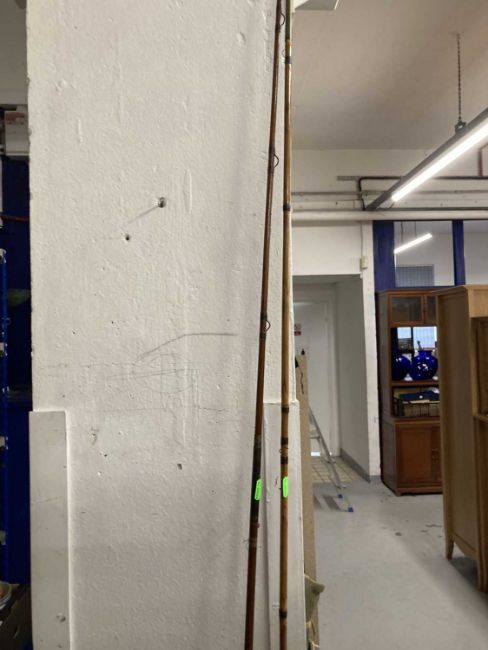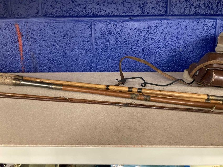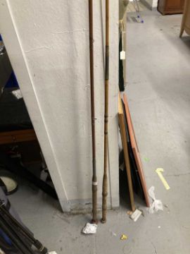 Fishing: Pair of fishing rods, one bamboo, both with cork handles.