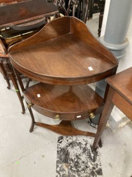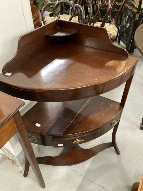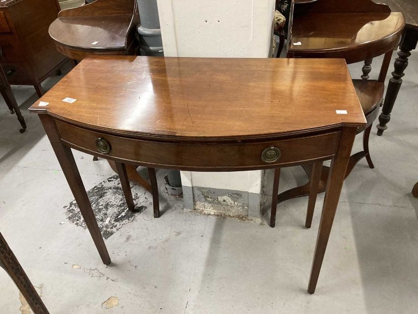 Furniture: 19th century demi-lune mahogany side table, single front drawer. Plus two 19th century mahogany two-tier washstands/bedside units with single drawer to lower tier the whole on splayed supports.