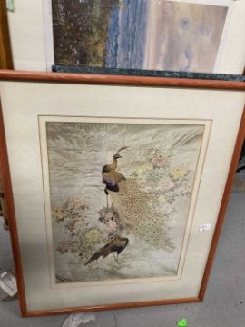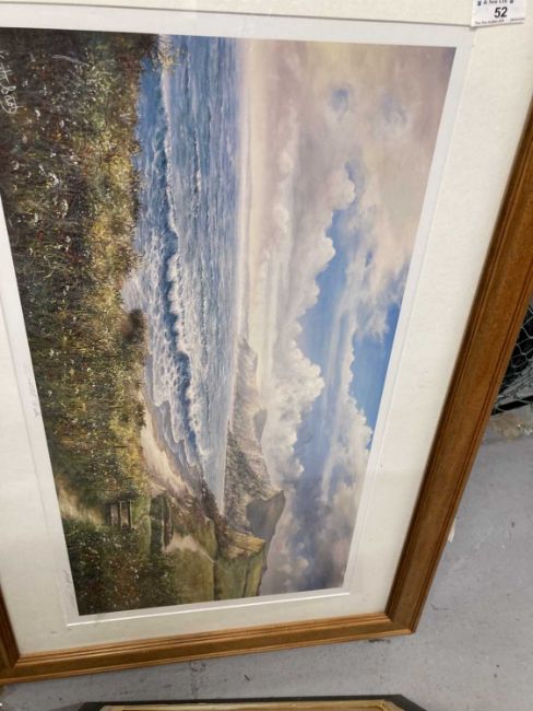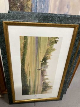 Prints: Keith Cast limited edition print Coastal Walk 778/850 signed lower right on the mount, 80cm x 55cm, a print of peacocks 48cm x 59cm and two golfing prints by R. Harnett, both 59cm x 39cm, all framed and glazed.