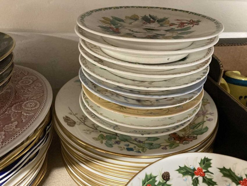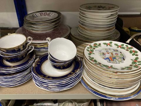 Ceramics: Royal Grafton Christmas plates 1976-1987. Staffordshire potteries, Christmas plates 1975-1978,1972-1974. Calendar plates Jan - December plus spares. Spode, Lancashire pattern modern-day reproduction. 6 dinner plates, 7 side plates, 12 tea plates etc.