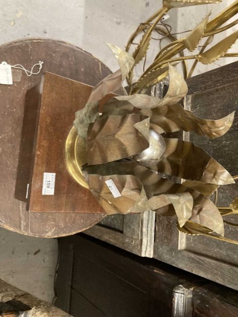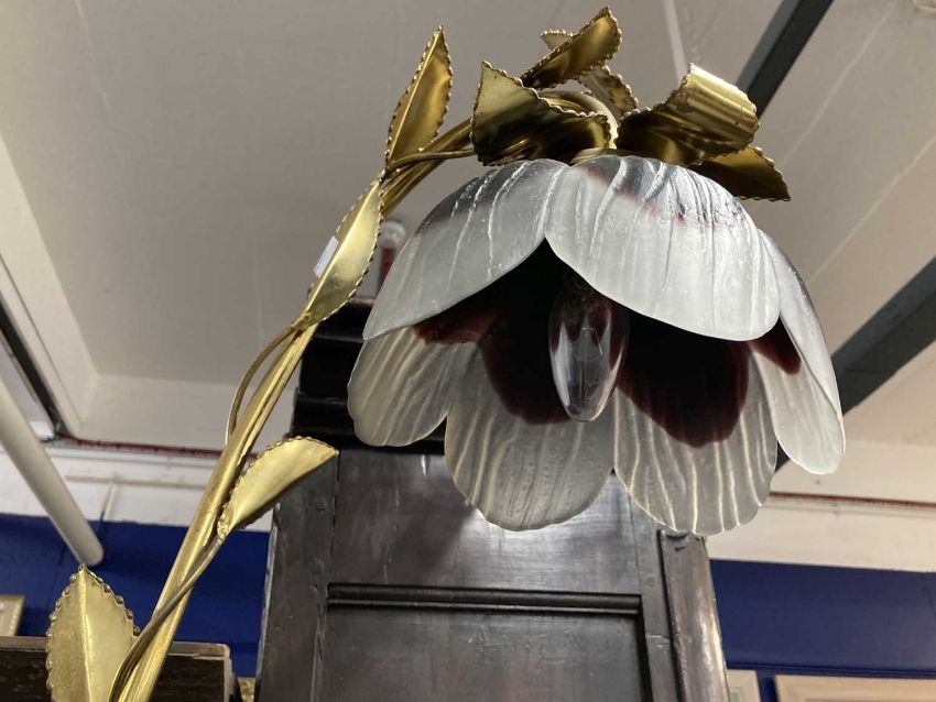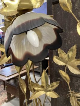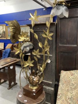 20th century Design: Hans Kogl Attributed gilt brass and copper foliage floor lamp, two stems with opalescent and brown lamps, another at the base, 53ins plus hardwood base.