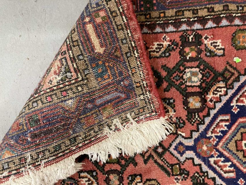 Carpets and rugs: Late 19th century/ early 20th century Persian prayer rug, hand knotted, red ground, three borders in one central gul decorated with geometric designs in reds, blacks, ivory and blue.