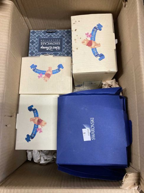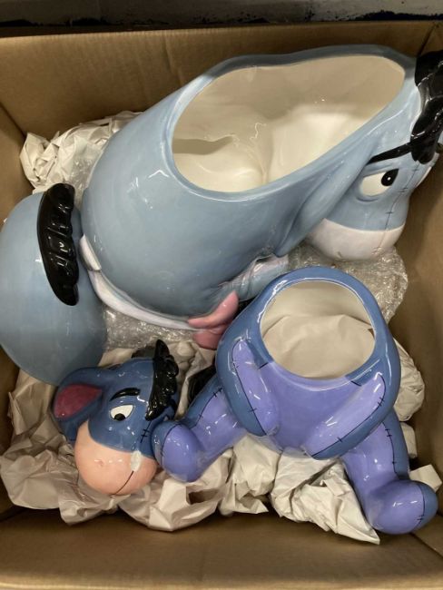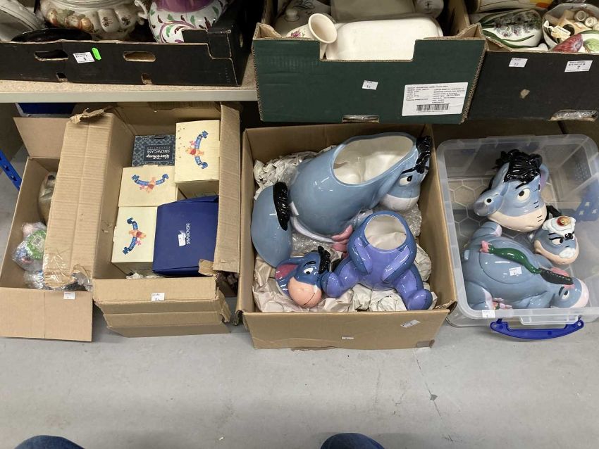 Ceramics: Collection of ceramic 'Eeyore' Winnie the Pooh collectable teapots, cookie jars, figurines etc. from Winnie the Pooh. Also, Swarovski 'Eeyore' figurine boxed. (3 boxes)