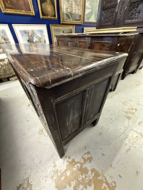 Furniture: 18th-century panelled oak coffer with additions and repairs. Carved Demi-Lune border decorations around four panels. Heavily carved with floral decoration with original candle box. 151 x 59 x 84cm