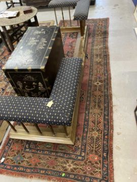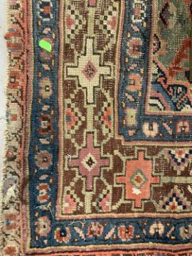 Rugs: Turkish Oushak runner with geometric and floral motifs with central pattern and border designs predominantly red with accents of blue, orange and brown. 320 x 120 cm