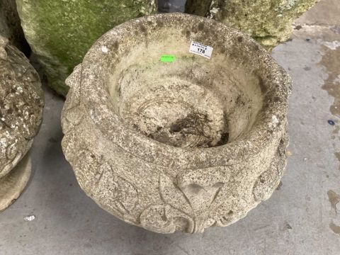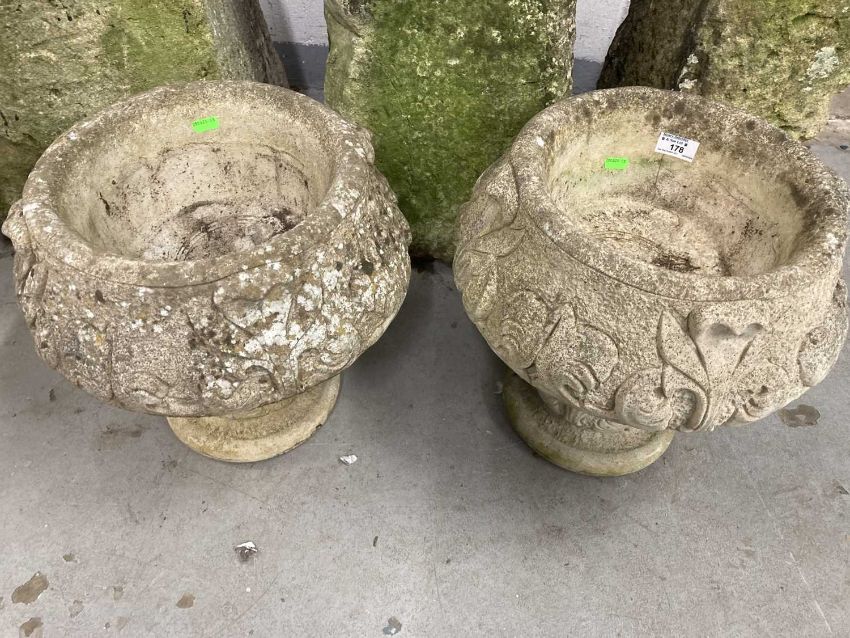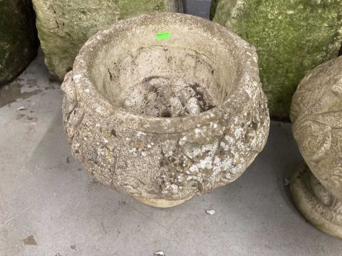 Gardenalia: Two small reconstituted stone urn shaped planters. Height 36cm x width 36cm.