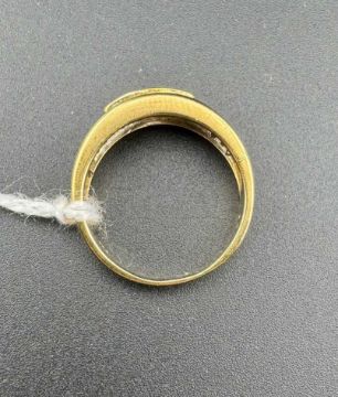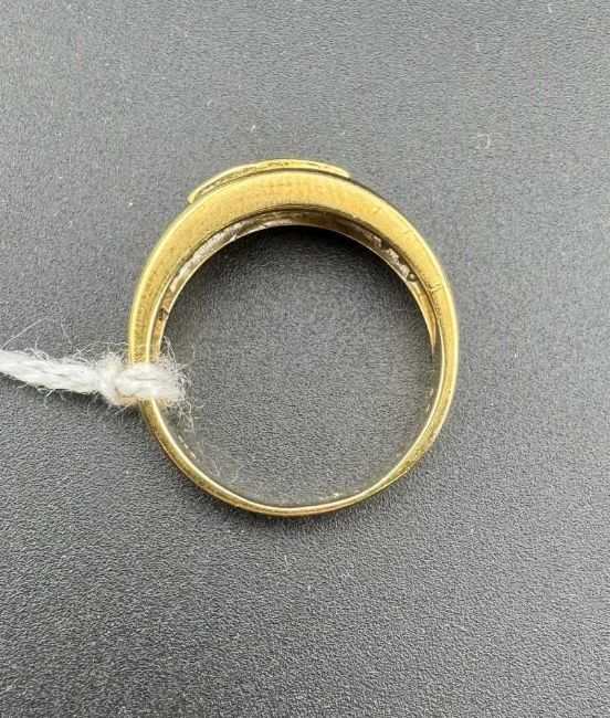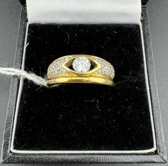 Jewellery: A yellow metal ring, marked 750 and testing as 18ct gold, set with a central 33 point diamond flanked on each shoulder by three rows of smaller diamonds, each around 1 point, total diamond weight approximately 67 points. UK size O, 5.6g.