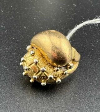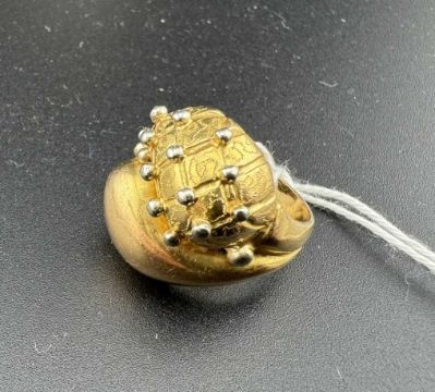 Jewellery: An Italian yellow metal ring, bearing Varese Italian 18ct gold marks and testing as such, designed in crossover form with one part plain, the other a simulated net. UK size H, 9.5g.