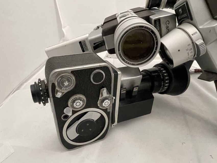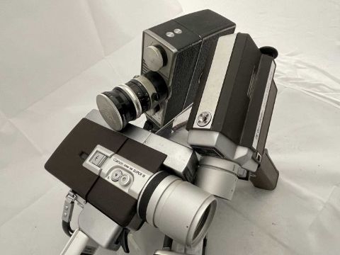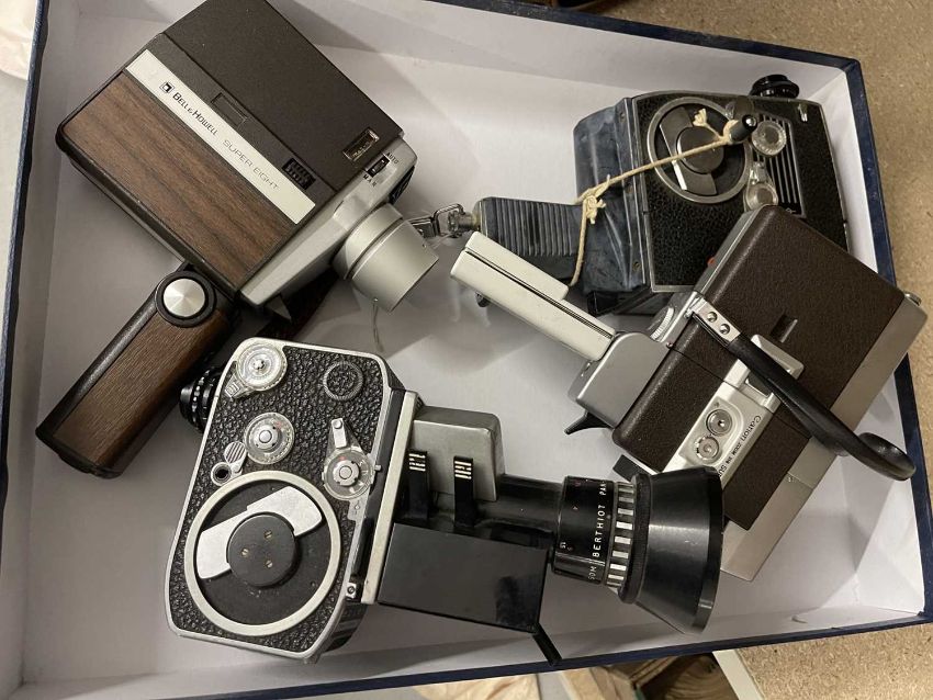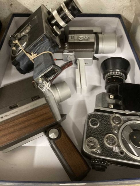 Cameras: A Bolex Paillard Zoom Reflex P3 camera, together with a Canon Zoom 318 Super 8 camera, a Bolex Paillard Super Reflex Automatic, and a Bell & Howell Super Eight camera.