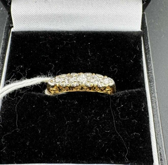 Jewellery: An early 20th century yellow metal ring, testing as 18ct gold, set with five graduated diamonds in a marquise pattern. UK size M½, 4.2g.