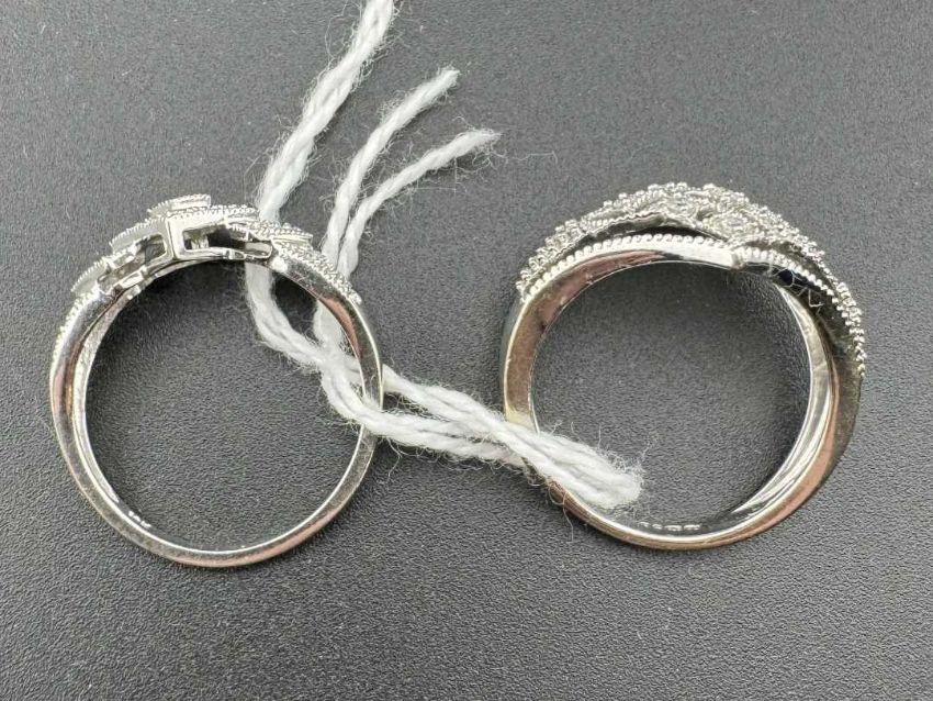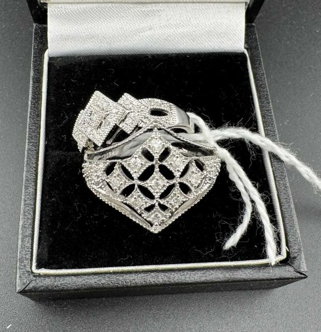 Jewellery: A 9ct white gold ring of latticework form, the table set with several small diamonds, UK size N, 3.5g; together with a white metal ring of stepped design set with diamonds, marked 10K, 2.1g.