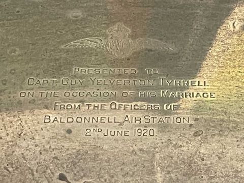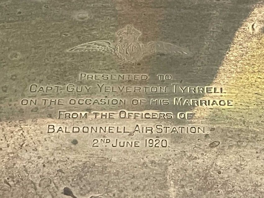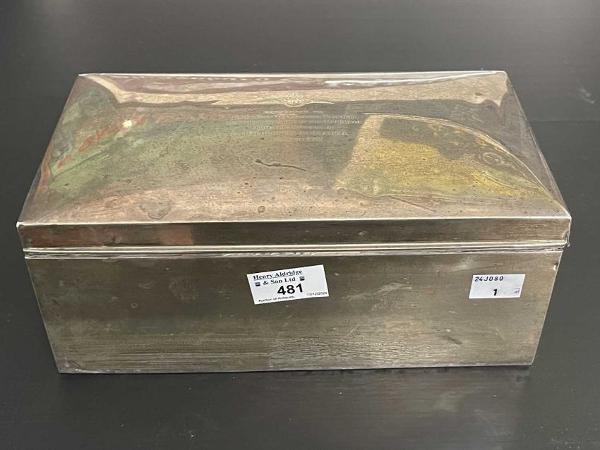 Hallmarked Silver: Royal Flying Corp box presented to Capt. Guy Yelverton Tyrrell on the occasion of his marriage by the Officers of Baldounell Air Station, 26cm x 10cm x 15cm.