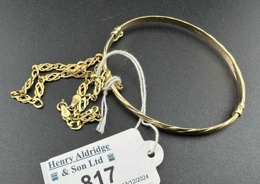 Jewellery: An Italian yellow metal hinged bangle, marked 375 and testing as 9ct gold, together with a 9ct gold open link bracelet measuring 24cm. Combined weight 7.4g.