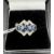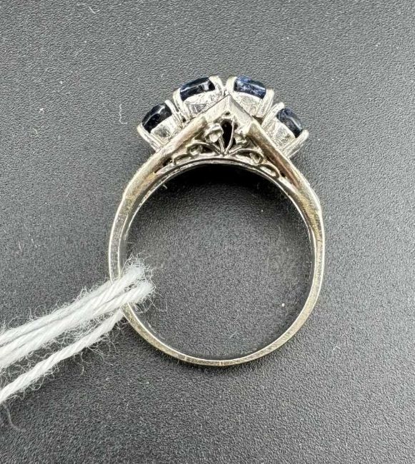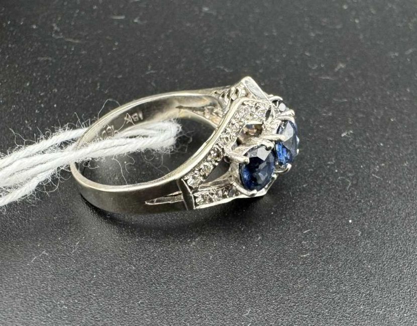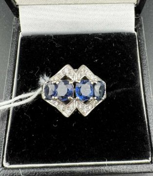 Jewellery: A white metal ring, marked 18k and testing as such, set with four sapphires each approximately 0.5 carats, within an Art Deco style framework of small diamonds, UK size M, 6.1g.