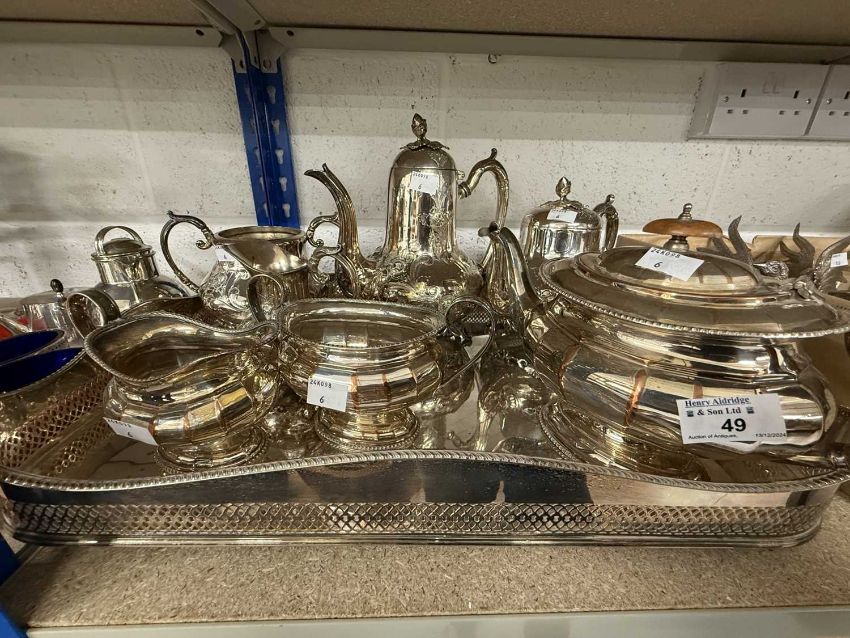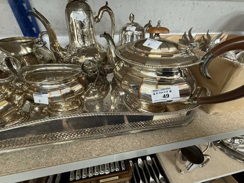 Platedware: Tea set Rococo style four piece with melon finials, Sheffield three piece tea set, plus large gallery tray.