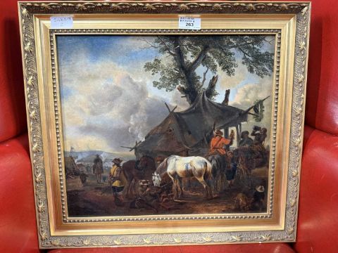 British School: Early 19th century oil on board 'A 17th Century Military Encampment' English civil war with horses to the foreground c1900-1920 unsigned in gilt frame, overall size 49cm x 44cm.
