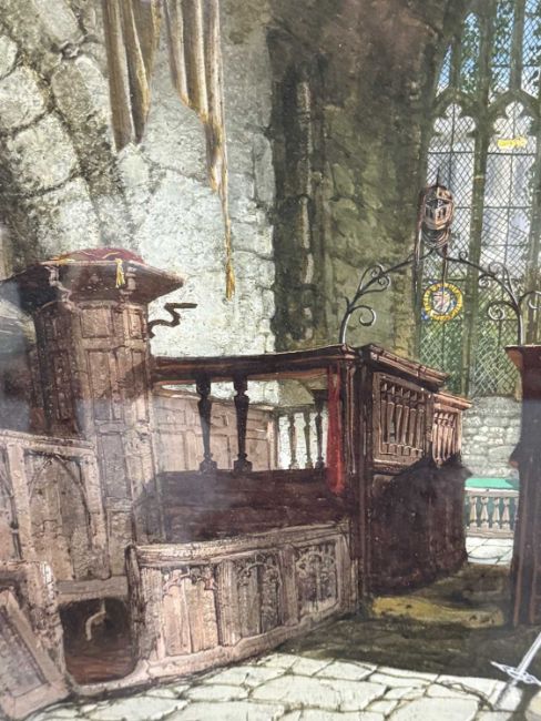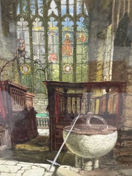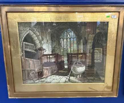 Samuel A. Raynor (act. 1820-1874): Watercolour and gouache interior of chapel at Haddon Hall. 75cm x 57cm.