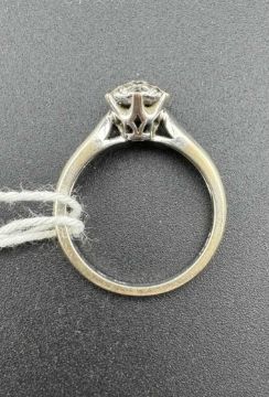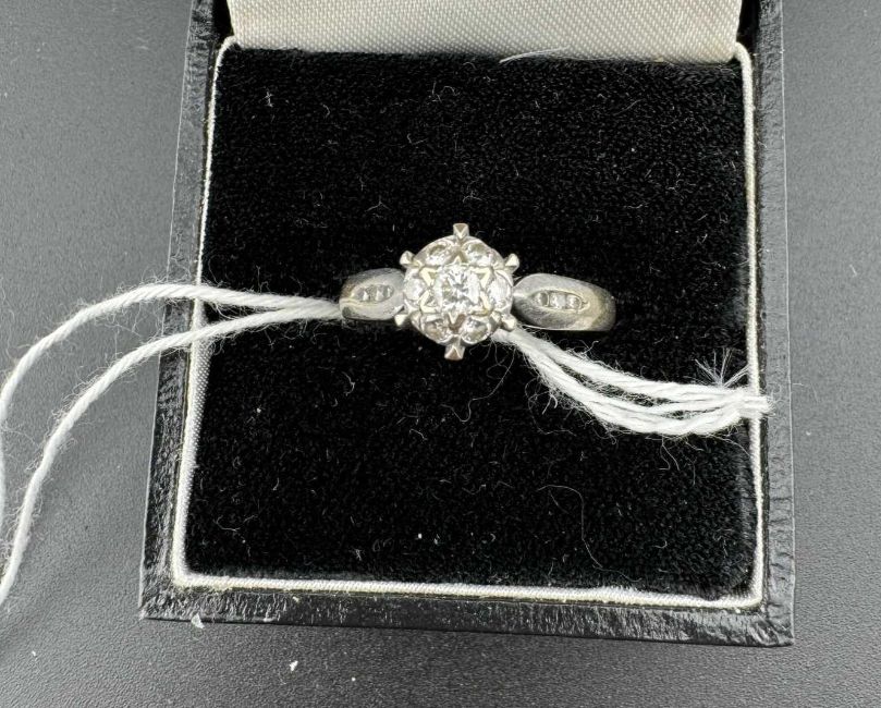 Jewellery: An 18ct white gold ring, set a cluster of diamonds to the head with three further on each shoulder, total 0.33cts. UK size L, 3.8g.