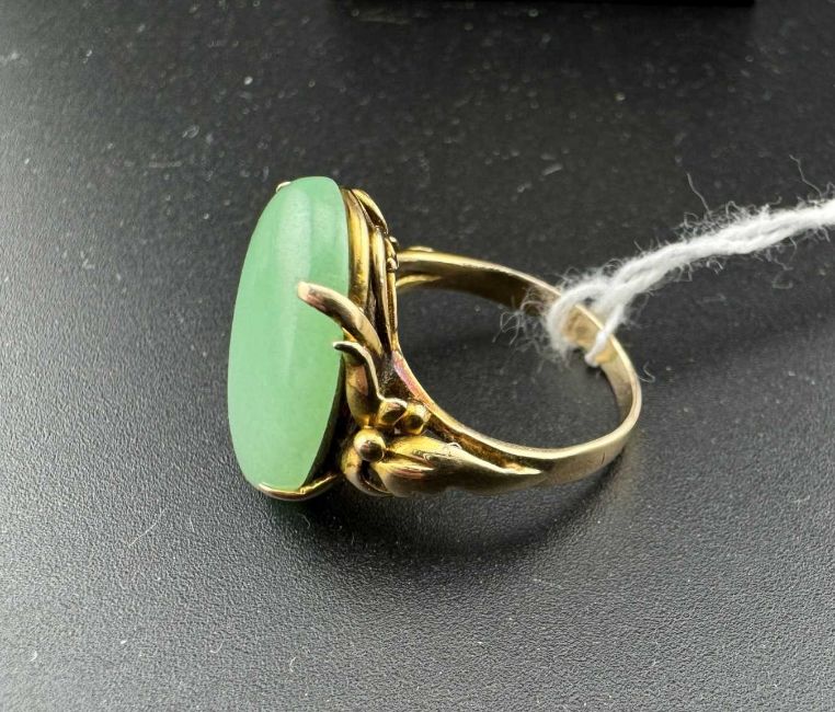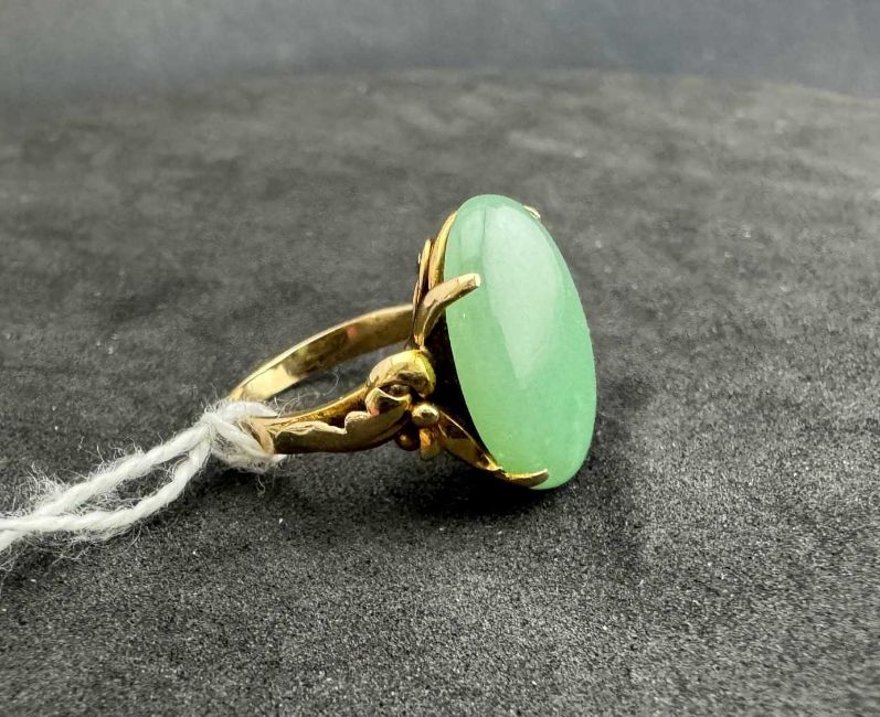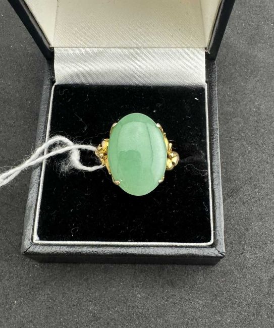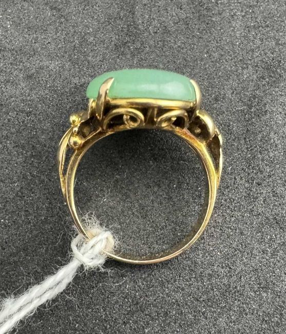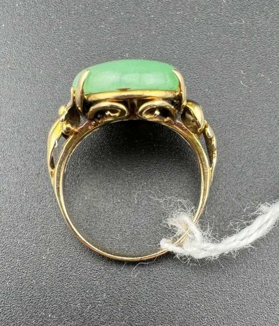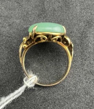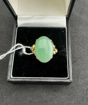 Jewellery: A Chinese yellow metal ring, unmarked but testing as 18ct gold, set with a single oval jade panel approximately 17.8mm by 12.7mm. UK size K, 5.4g.
