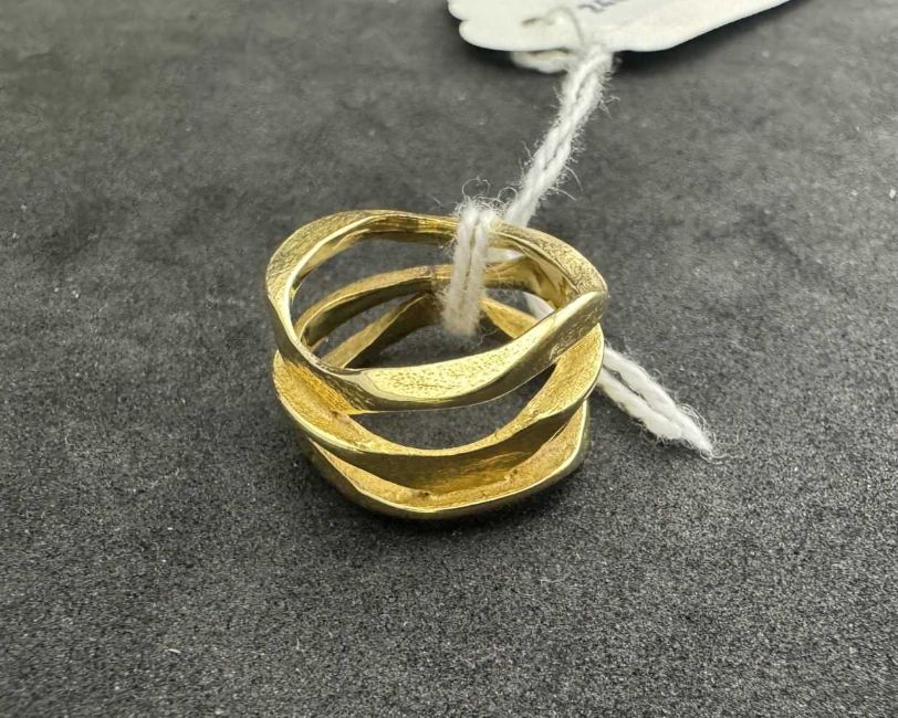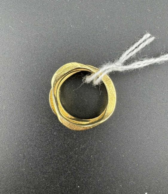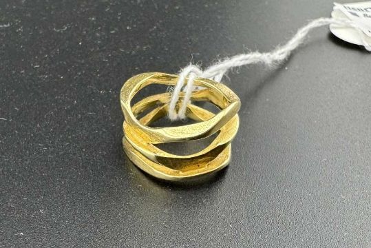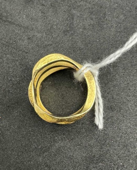 Jewellery: A yellow metal ring, indistinctly marked but testing as 18ct gold, designed as three irregular bands joined as one. UK size J, 6.5g.
