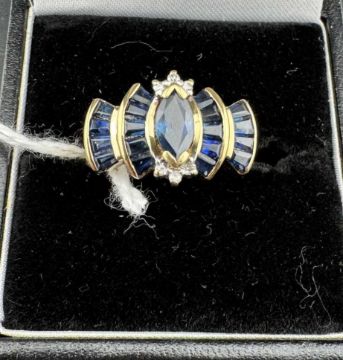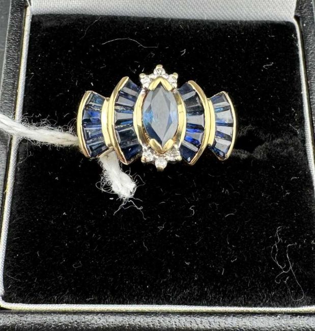 Jewellery: A 9ct gold Art Deco style ring, a central marquise cut sapphire with three diamonds top and bottom, flanked to each side with two rows of calibre cut sapphires mounted in an arc. UK size N, 3.4g.