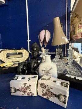 Collectables: Ceramics, a Copenhagen flask, girl holding a piglet, 2 acorn nases boxed, cut glass dressing table set, boxed hand mirror, African carved figures, 2 elephants, treen pen box, etc.