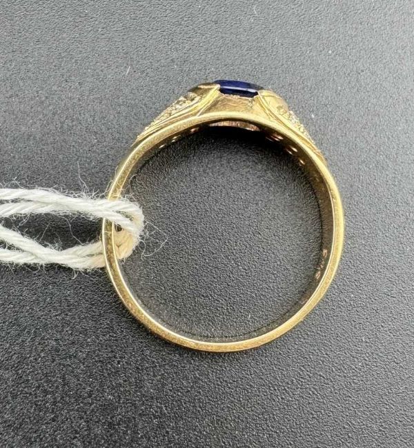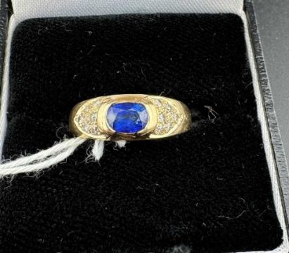 Jewellery: A yellow metal ring, marked 585 and testing as 14ct gold, rubover set a central sapphire flanked by 6 diamonds to each shoulder. UK size M, 3.7g.