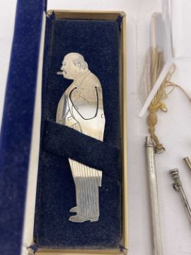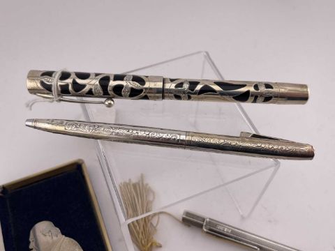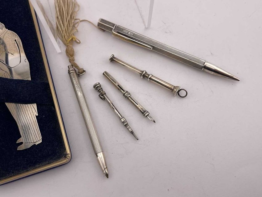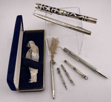 Desktop Items: A Sheaffer silver clad fountain pen with 18ct gold nib, a silver propelling pencil, two further silver pens, two silver toothpicks, etc.