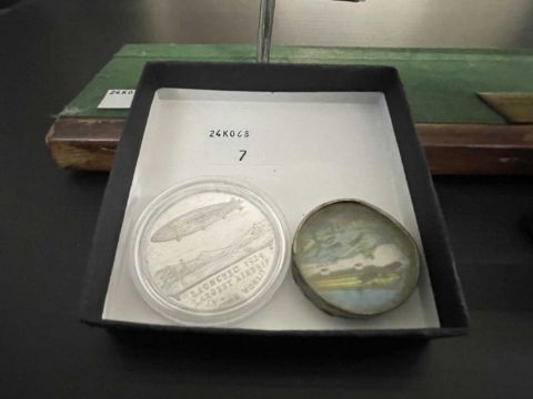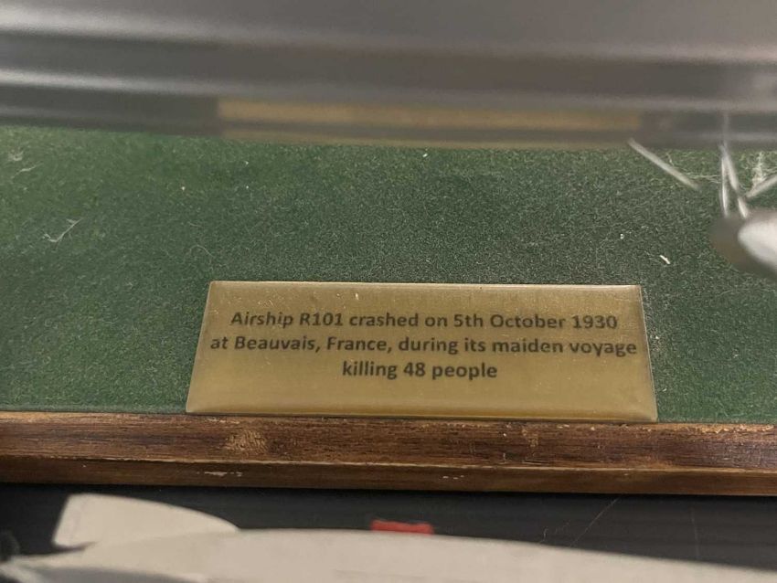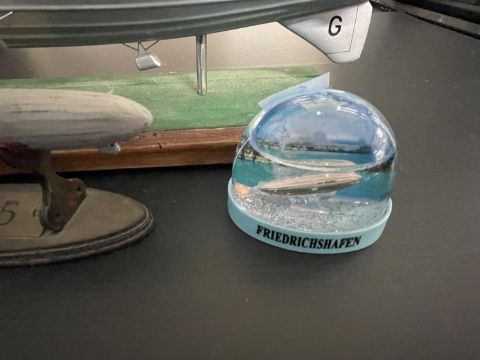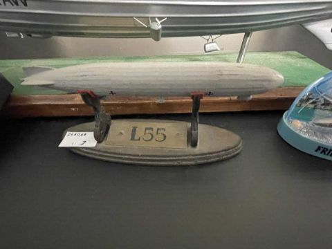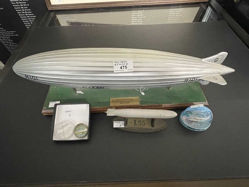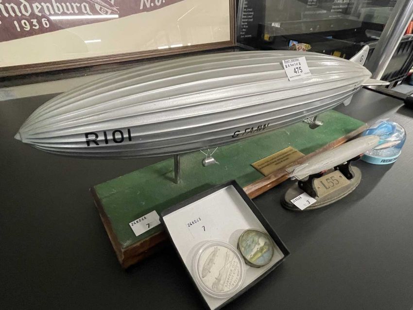 Airship/Zeppelin Memorabilia: Desk model R101 21ins, lithographed tinplate ball toy, plus Gaunt aluminium coin promoting R101, a diecast L55 desk model 6ins, and a modern commemorative snow globe.