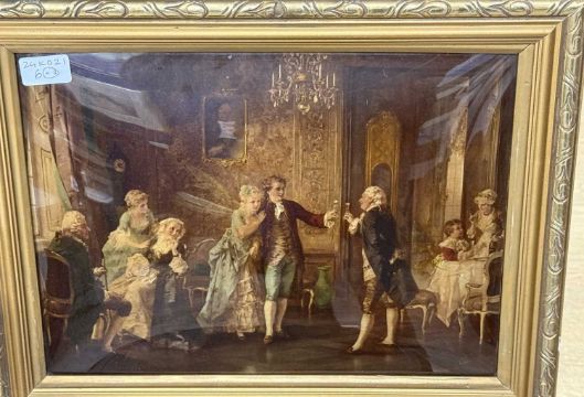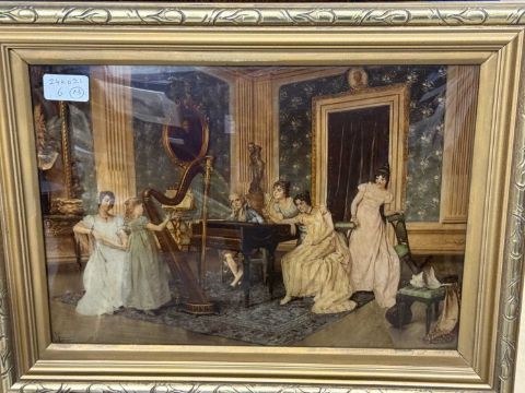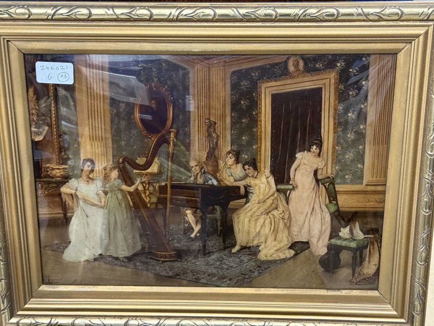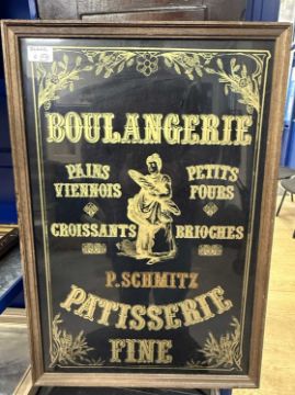Crystoleums: A pair of Victorian interior salon scenes by F. Hanes 1897, convex glass bin gilt frames together with a reverse glass advertisement for a Boulangerie, oak framed c1910-1930, overall size 63cm x 42cm.