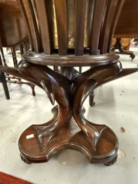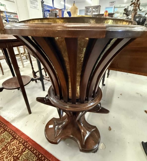 Furniture: 20th century mahogany jardiniere with a slatted out swept top raised on three dolphin supports over a trefoil base and fluted feet. 72cm high x 50cm diameter.