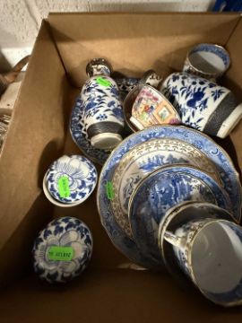 Ceramics: A pair of Chinese bird painted vases, 16cm; an 18th century English Chinoiserie tea bowl and saucer, possibly Newhall; and a collection of English and Chinese blue and white.