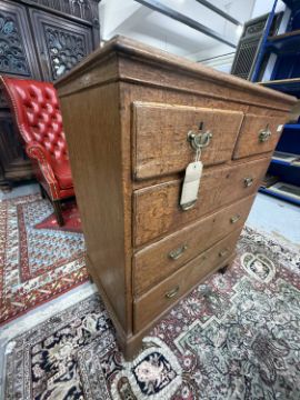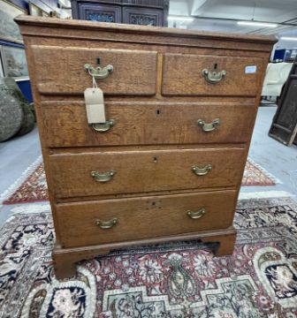 Furniture: Chest of drawers, late 18th century, oak construction throughout, 2 drawers over 3 drawers configuration, replaced handles, the top has repairs that show it once had a fitted cloth press above. Height 98cm width - 77cm depth - 48cm