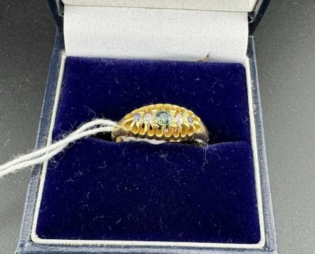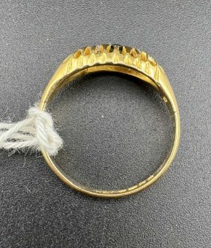 Jewellery: An 18ct yellow gold ring of navette form, claw set with a central green stone, possibly a green sapphire, between two diamonds and two small blue sapphires. UK size M, 2.8g.