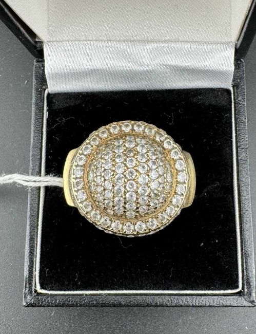 Jewellery: A yellow metal ring, marked 9k and testing as such, cluster set with white topaz. UK size 5, 8.7g.