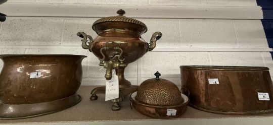 Metalware: Early 20th century copper planter x 2, warming plate and cover