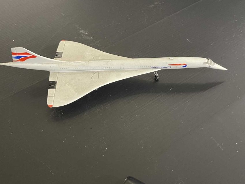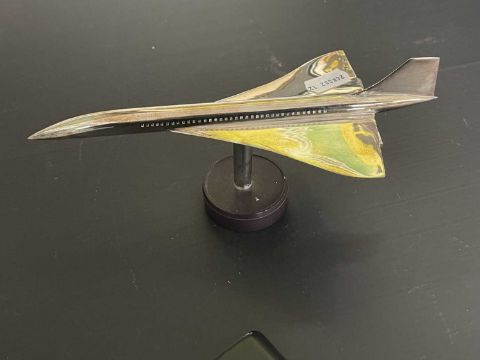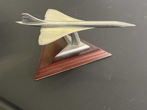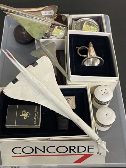 Aeronautica: A silver plated model of Concorde on stand, 20cm; another in pewter; two Concorde pebble boxes; a Concorde cruet set, and other Concorde related items.